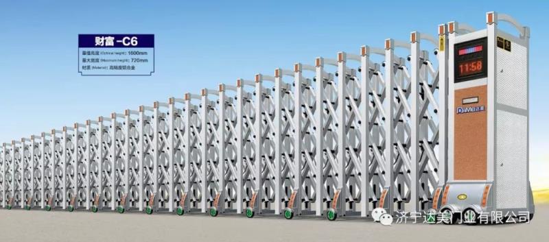 财富-C6电动伸缩门采用平行四边形原理铰接,门体采用优良铝合金及普通方管制作,伸缩灵活行程大;该伸缩门又叫电动门,主要是由门体、驱动器、控制系统构成,大多用于各类工矿厂房、车间、仓库、机房、车库等地。财富-C6电动伸缩门门排主框及斜管截面采用圆形设计,门体整体外观大方、稳重。